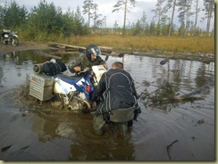 Познакомился с Владимиром “Черепахой”. По его отчёту я ехал в этом году от Перми до Якши. Он проехал по этой дороге несколько лет назад, но только от Якши на Пермь. А в этом году проехал с сотоварищами по БАМу до Тынды и далее до Магадана. Как показала практика, мир мототуристов достаточно тесен. Володя оказался интересным собеседником и весёлым человеком. На этом мероприятии грустных и не интересных людей не было. Только творческие личности могут решиться поехать в такую погоду в болота и пески, топить мотоциклы в глубоких лужах и бродах, да ещё этому потом радоваться.