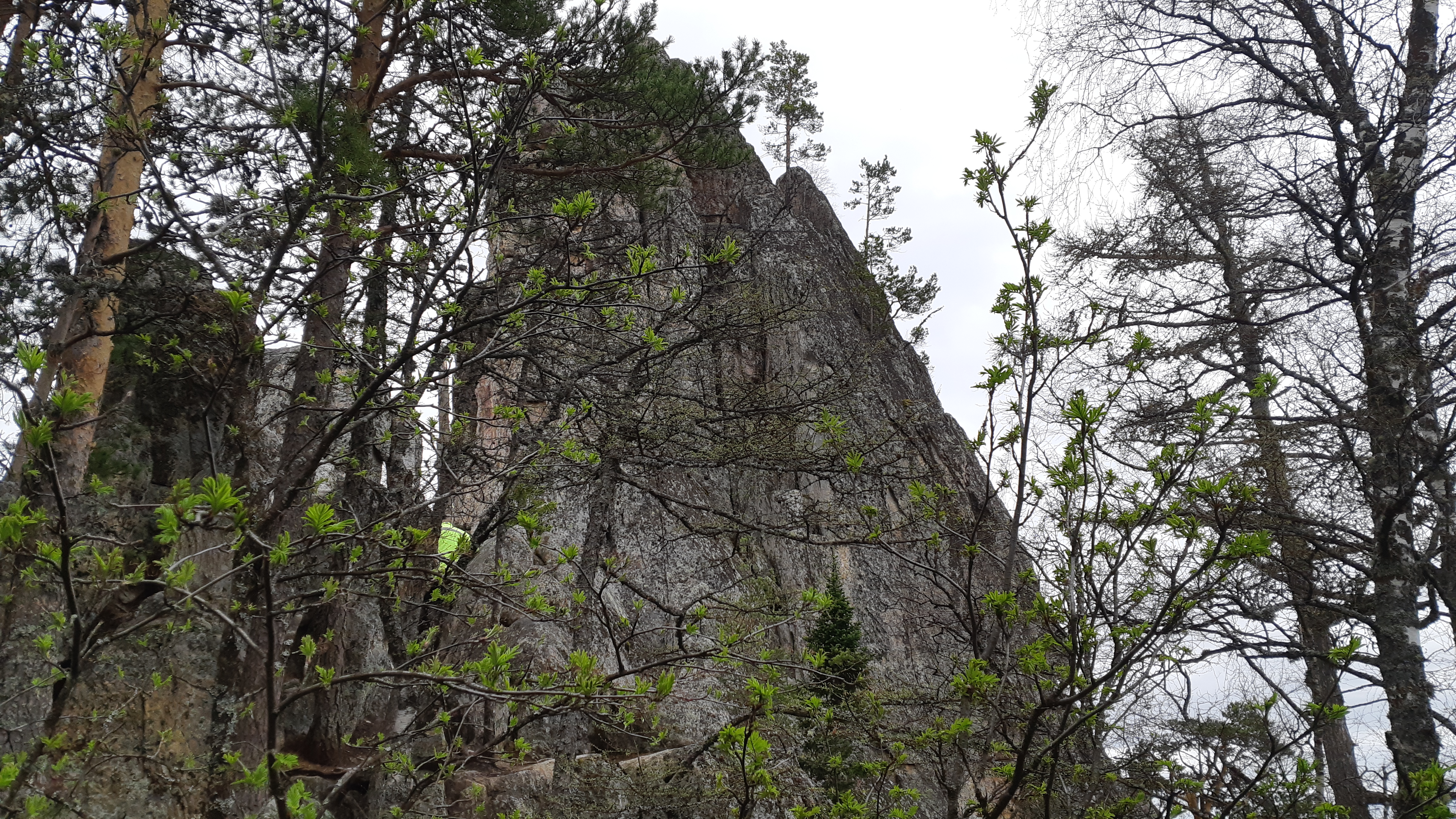 К вечеру приехали к зубчаткам. Место так себе, бурелом выпиленный. Пни торчат повсюду, брёвна напиленные валяются невпопад. Подъехали по склону вверх прямо под эти самые зубы. Я на скалы эти забрался, думал это целый массив. Но нет, это просто узкий ряд скал, за стеной которых была лесная ровная долина. Встали лагерем прямо под скалами, выбрав на склоне ровные местечки под палатки.